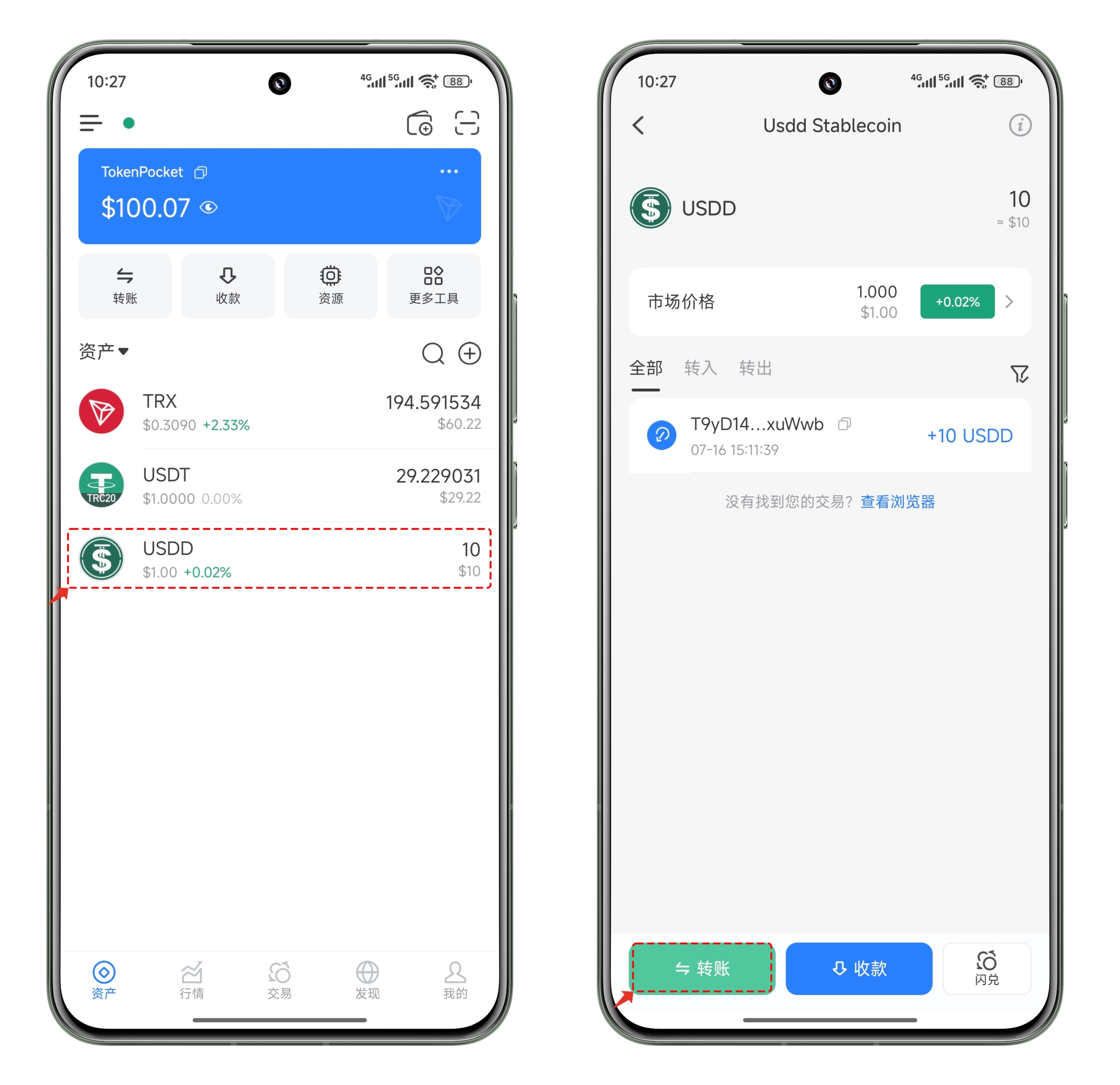 1、打开 TokenPocket,点击需要转账的代币,例如[USDD],代币界面点击左下角[转账]。