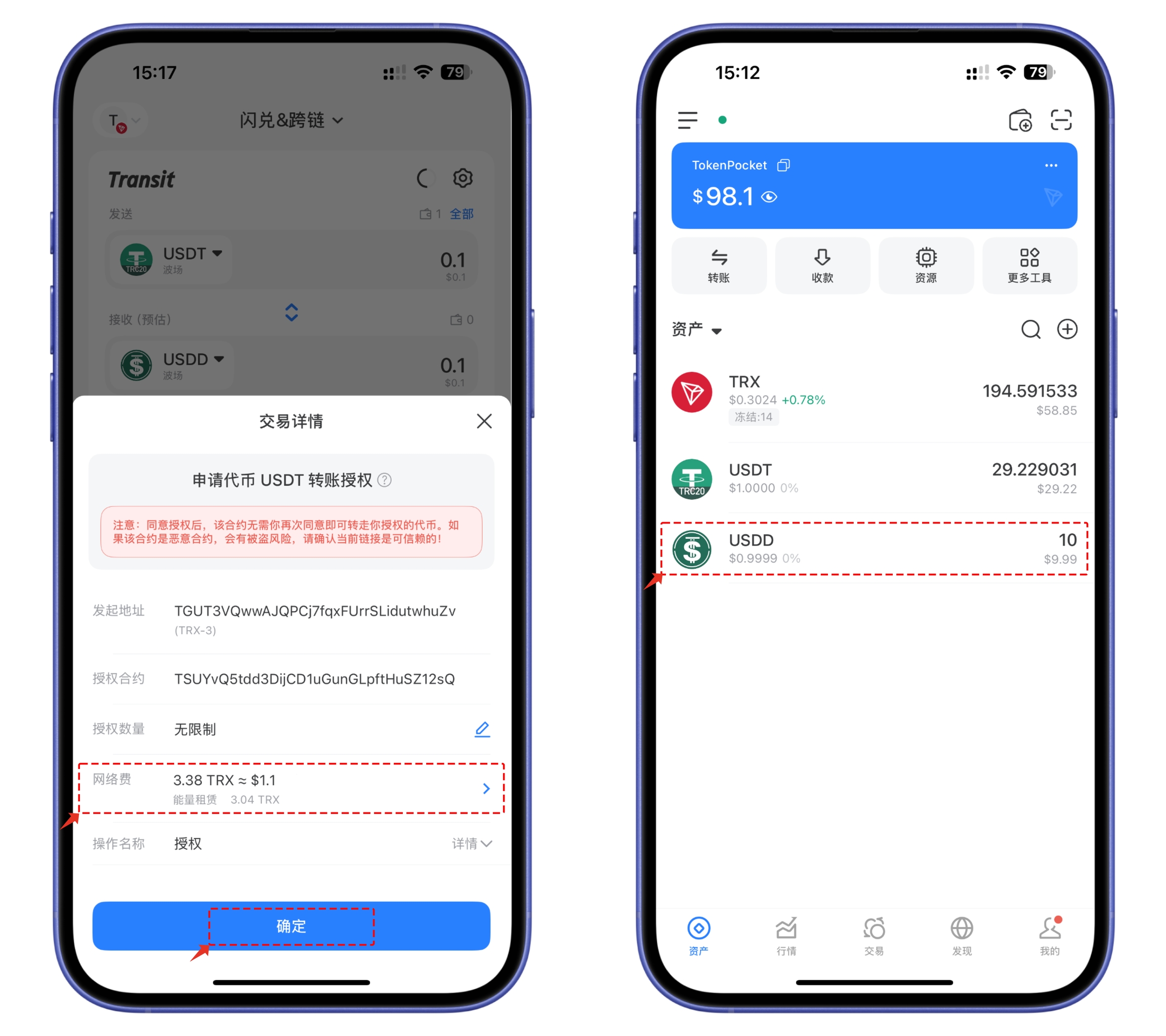 3、执行过程中需要注意网络费的花费,点击网络费可以勾选能量代付或 USDT 代付功能执行,兑换完成后就可以看到兑换的 USDD 代币。