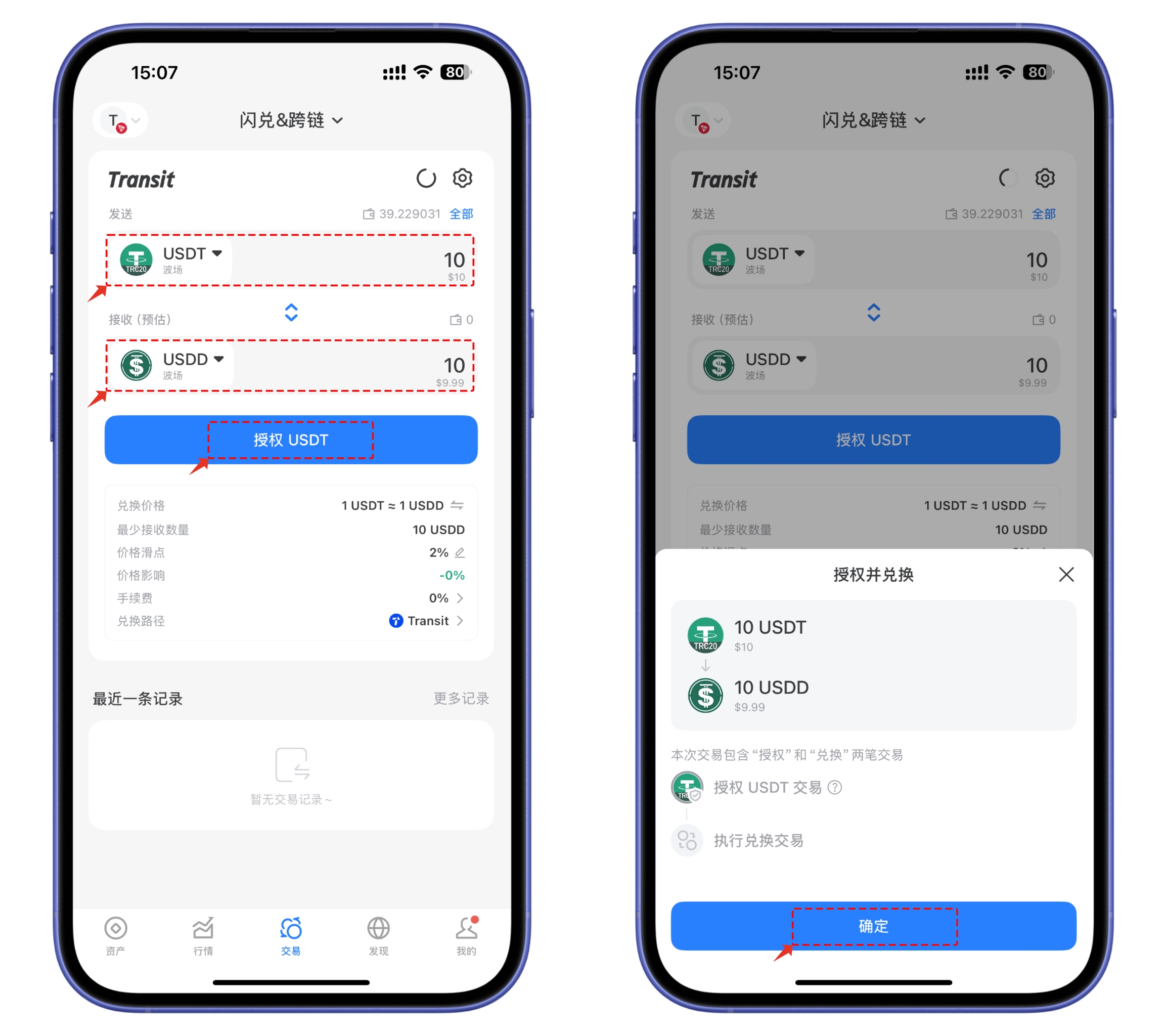 2、兑出选择 USDT,兑入代币选择 USDD,设置好需要兑换的数量,点击【授权 USDT】。因为是首次执行对 USDT 的调用,所以会需要2个步骤,先进行授权再进行兑换。