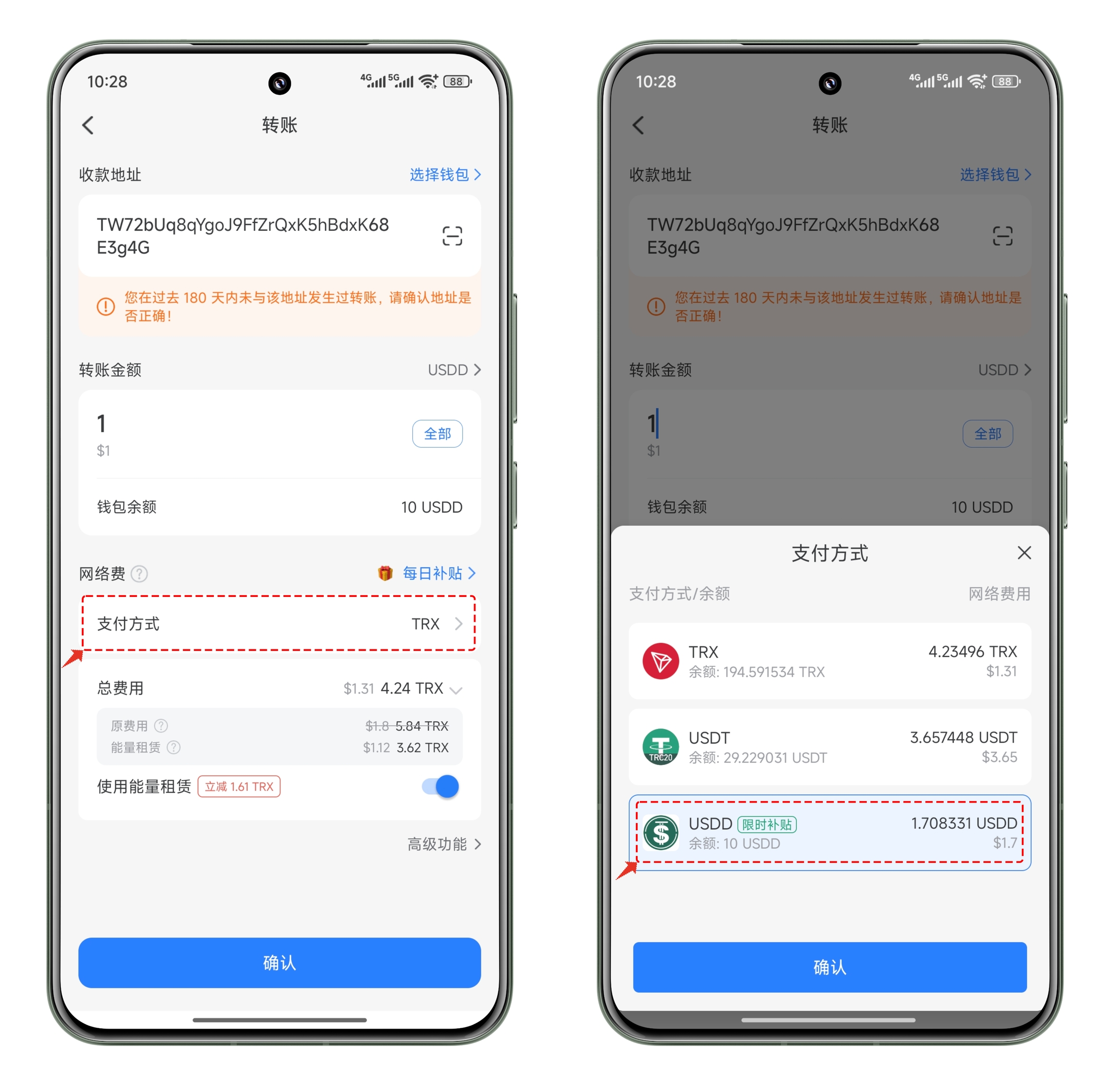 2、转账界面中,默认支付方式是 TRX,如果使用 TRX 支付,请勾选能量租赁功能。 点击[支付方式],选择 USDD 付款方式,现在还有限时补贴,转账费用非常划算。