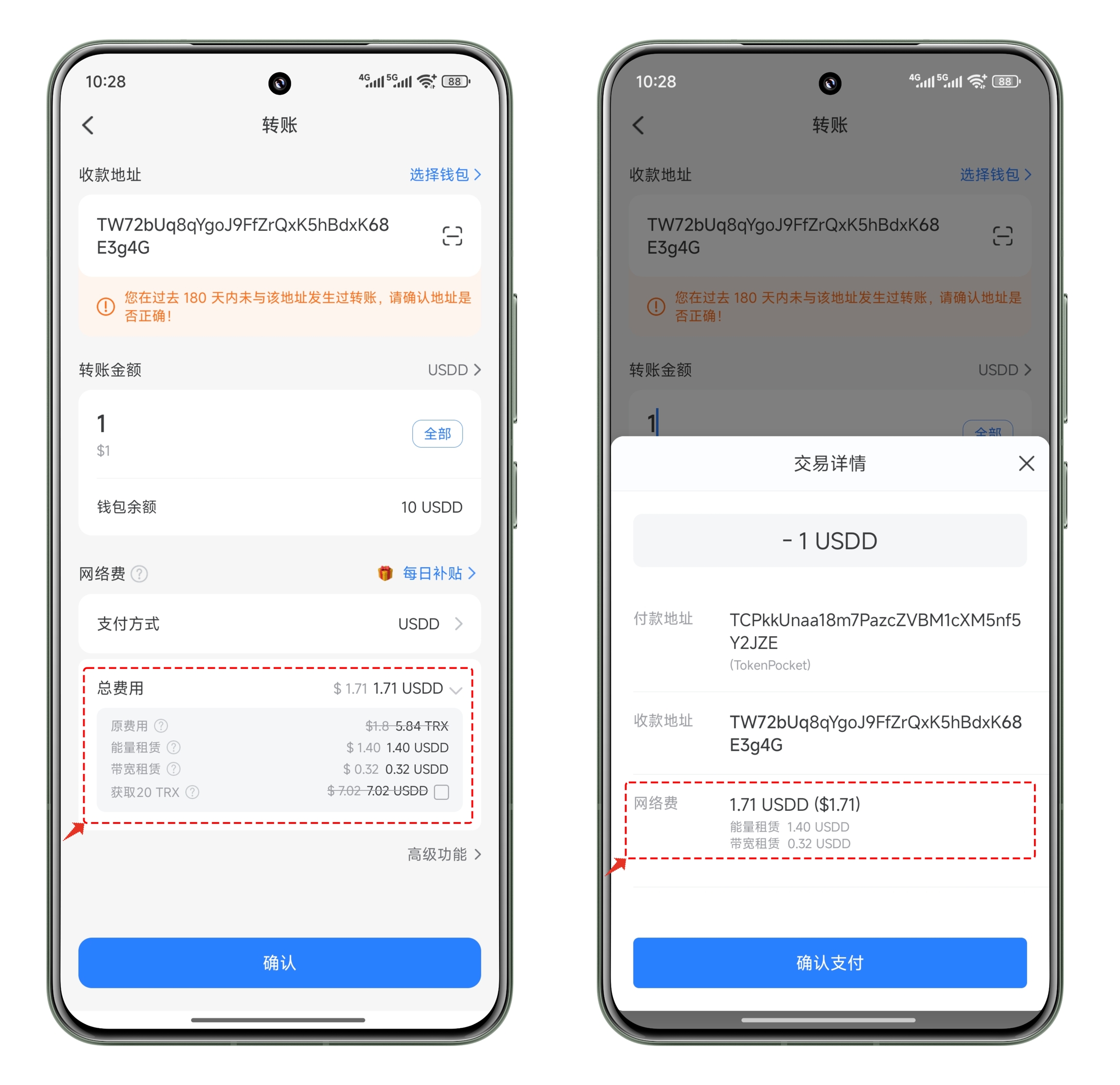 3、选择 USDD 代付方式后,就可以看到详细的租赁界面,里面包含了对带宽和能量的租赁参数,还可以勾选购买20 TRX ;确认后,在交易详情界面可以看到网络费内容已经变成了 USDD ,最后点击[确认支付]即可执行上链操作。